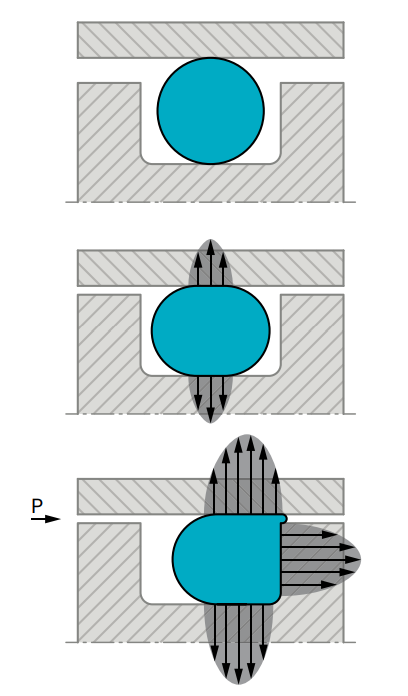 O形圈是一种双向密封元件。安装时,O形圈径向或轴向的初始压缩量决定了O形圈的初始密封能力。系统压力作用于O形圈所 产生的力,就是其总的密封力;该密封力随着系统压力的升高 而增大。在压力作用下,O形圈的形状和具有高表面张力的液体相仿,压力朝各个方向等值传递。